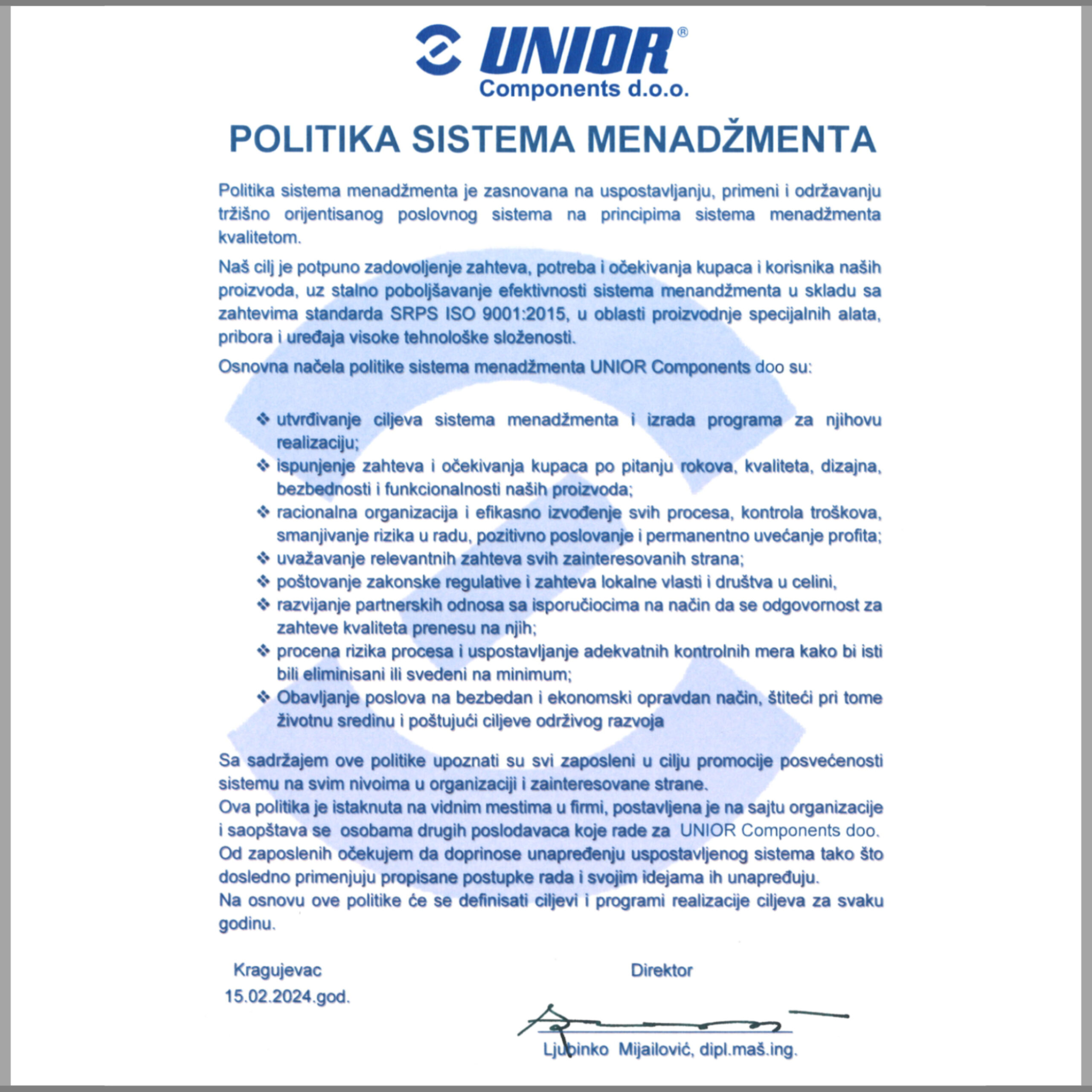 Osnovna načela politike sistema menadžmenta UNIOR Components doo su: